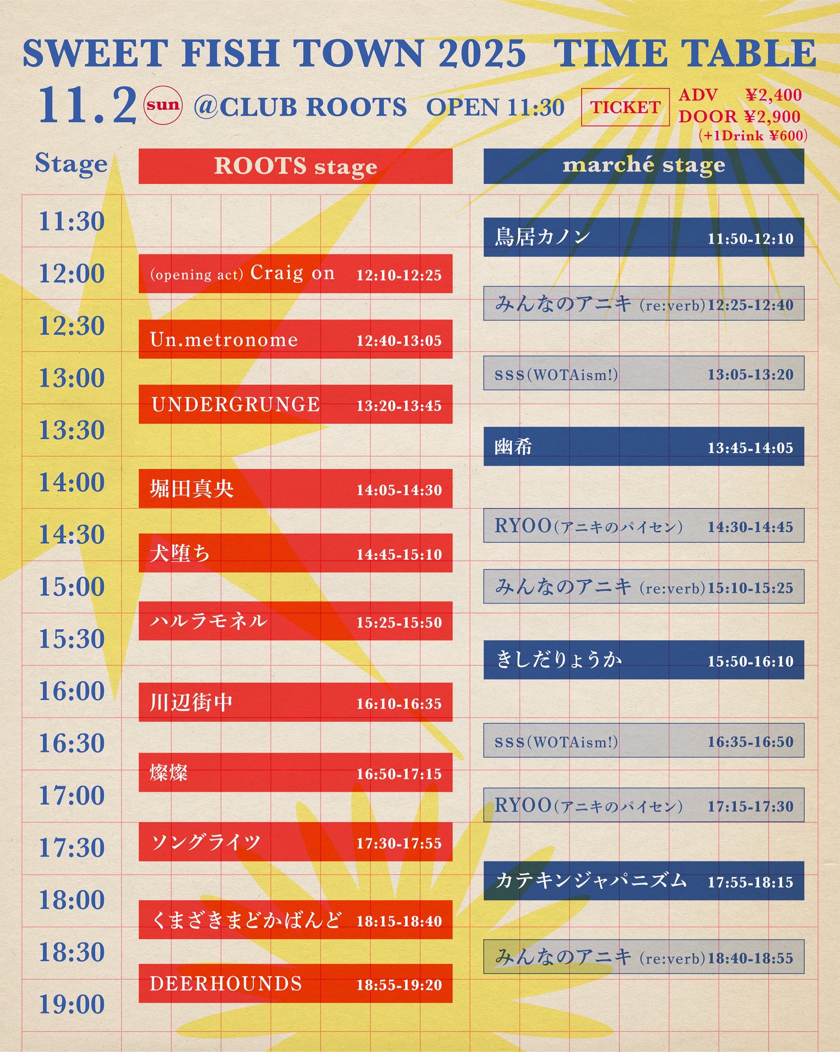 ソングライツ/DEERHOUNDS/堀田真央/くまざきまどかばんど/燦燦/UNDERGRUNGE/The velvet fan club/川辺街中/犬堕ち/鳥居カノン/幽希/ハルラモネル(バンド編成)/きしだりょうか/カテキンジャパニズム/(opening act)Craig on -
